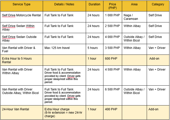 – Self-Drive Motorcycle: Naga pick-up, Caramoan drop-off only