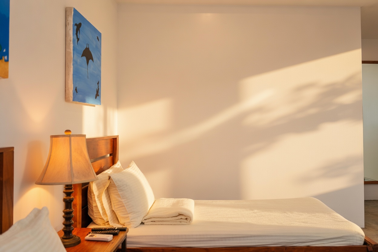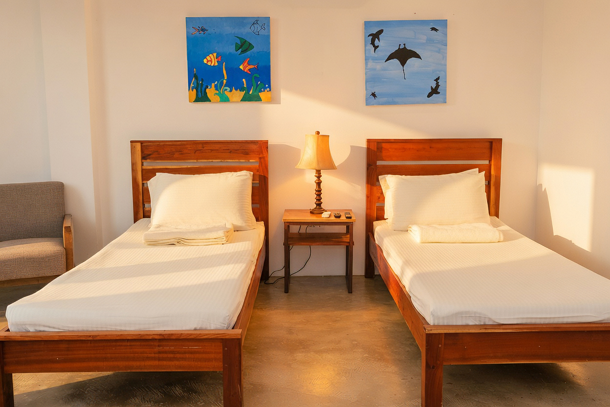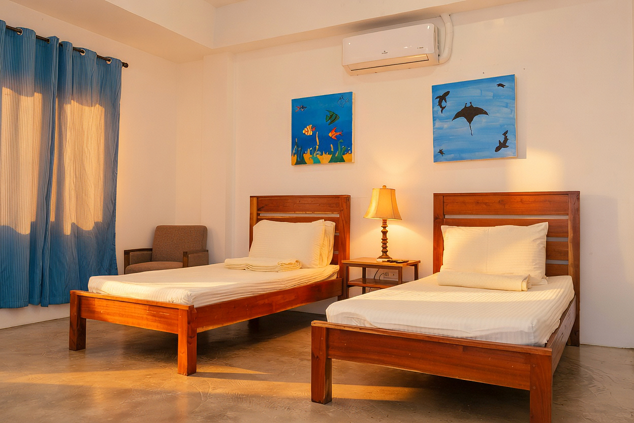 Our Twin Room combines spaciousness, aesthetic wooden design, and minimalist elegance to create a calming atmosphere where you can relax and rejuvenate. It has air conditioning, a flat-screen TV with cables, private bathrooms with hot and cold water, a hairdryer, and a full-length mirror. WiFi is available at no charge. Provisions for toiletries and bottled water are replenished daily.